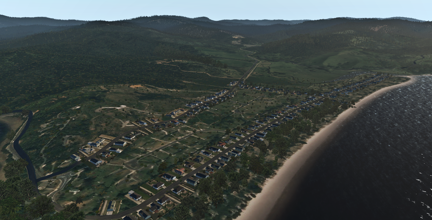 Working with LINZ data, I initially focused on the Coromandel tile as I like flying in and out of Great Barrier Island with my little black Cessna Centurion. I had an ambitious goal of providing ortho-photos that would work seamlessly with the overlay layer. This meant photo-shopping the roofs of buildings out of the photos so that they wouldn’t be painted on the ground. I find this quite jarring on-approach when you see 2D paint rooftops and trees appearing on the ground.