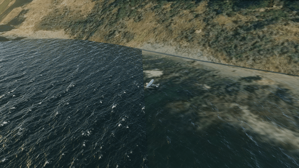 Number 2, is that the old ortho tiles are missing the details of turbidity(waviness) and bathymetry (depth), so you end up with 3D water that doesn’t do the new fancy stuff with rough waves etc.
